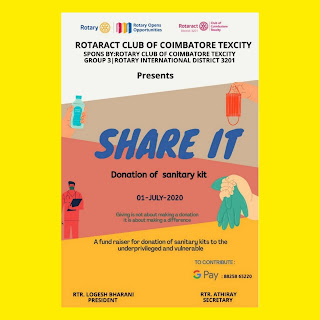 We the Rotaract club of Coimbatore Texcity are nowhere with a fundraiser project “Shareit”, which aims at donating sanitary kits to the vulnerable and underprivileged. We have planned to donate the Sanitary kit on July 01 and planned to continue the donation with the funds raised as many people will be benefited from it.
